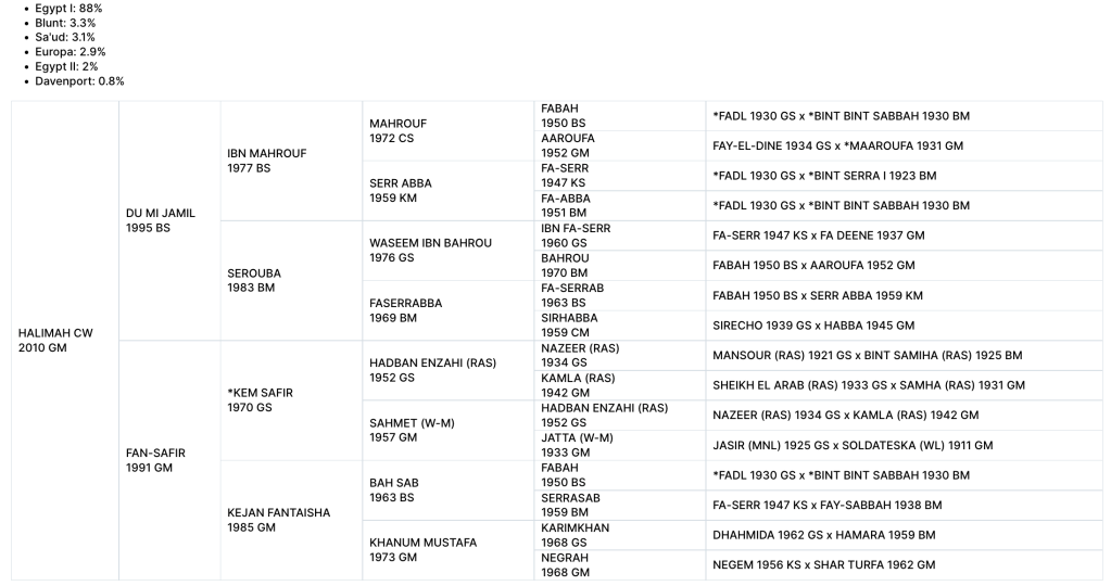 Halimah has the highest percentage of Old Egyptian (Babson) breeding in the program. Her pedigree is testament to the power of outcrossing, as both of her fillies are incredibly beautiful, personable, and athletic.
