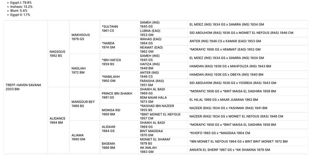 Savana’s sire is the late Nagsous bred by Gleannloch Farms and was shown in Arabian Breeding Stallion classes. Her paternal grandsire Makhsous owned by Gleannloch Farms, and who is a leading Straight Egyptian sire in National Winners. He did not produce a high number of offspring, but a large percentage of them were National Title winners.