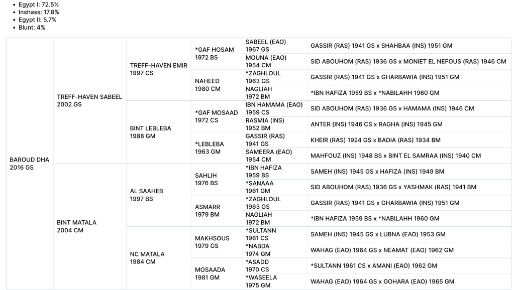 Through his dam side, Baroud traces to Asadd who was twice Top Ten in Arabian English Pleasure. He also traces to Makhsous who was a leading winning producing sire through his get.